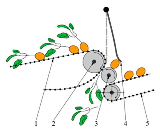 Schematic diagram of the stem–leaf deflector rod operation. 1. Primary elevator chain; 2. Main drive shaft of the elevating chain; 3. Stem–leaf deflector rod; 4. Rubber separation curtain; 5. Secondary elevator chain.