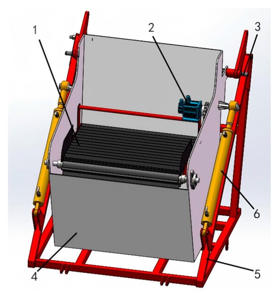 Four stem–leaf deflecting rods are also installed between the secondary transmission chain and the scraper conveyor belt. Their function is similar to that of the stem–leaf deflecting rods in the primary elevator chain, enabling the further removal of residual weeds and stems. The crushed soil manually falls onto the conveyor soil belt through the gaps in the secondary elevator chain. To prevent soil clumps from falling onto the harvester frame, the width of the soil conveyor belt must be significantly larger than that of the secondary separation elevator chain. The width of the elevator chain is 1000 mm, and that of the soil conveyor belt is 1350 mm, which conveys the crushed soil downward to the ground surface.