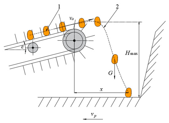 In Formula (11), Xmax is the maximum height to which the potato is thrown when it detaches from the elevator chain in the direction perpendicular to the chain surface; v2 is the component velocity of the potato in the direction perpendicular to the chain surface, m/s; and vp is the forward speed of the harvester, m/s. In Figure 13b, v1 is the linear velocity of the elevator chain, which is perpendicular to v2. By substituting the acceleration a from Formula (9) into Formula (10), Formula (12) can be obtained.