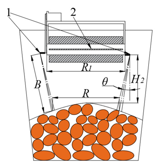 Selecting an appropriate shovel surface inclination angle α ensures that the shovel cuts through soil ridges and smoothly conveys the potato–soil mixture to the rear [23]. A smaller angle improves soil penetration but prolongs the residence time of soil and potatoes on the shovel surface, leading to soil blockage. A larger angle enhances soil crushing performance yet increases shovel surface resistance, impairing soil penetration. The relevant literature indicates that when the shovel surface inclination angle ranges from 10° to 20°, the traction resistance is relatively low and the soil crushing effect is favorable [24]. The designed shovel surface is welded to the connecting frame of the digging shovel, which is connected to the harvester frame via a rotating shaft. Prior to operation, the soil penetration angle can be adjusted by changing the angle of the connecting frame, and it is fixed at 20° under normal working conditions.