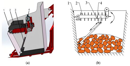 Schematic diagram of the adaptive adjustment device for potato dropping height of the potato collecting box. 1. Potato collection box; 2. Scraper conveyor belt; 3. Electric push rod for conveyor belt inclination adjustment; 4. Photoelectric sensor: (a) 3D schematic diagram, (b) 2D simplified structural diagram.