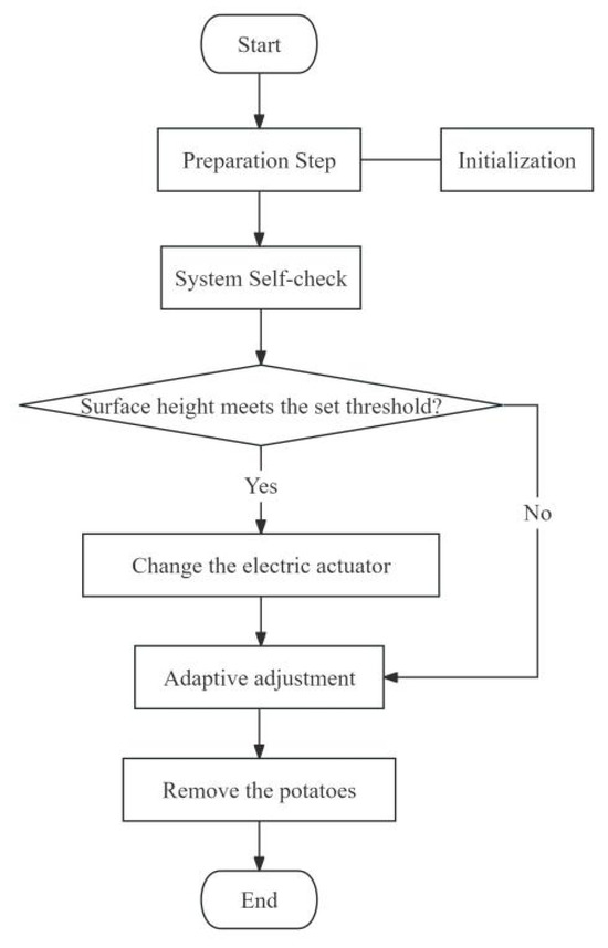 The main logic flow of the height-adaptive potato collection device control system is as follows: When the system is started, it initializes the parameters. The system then enters a self-checking state, during which the actuators automatically reset, and the electric push rod stroke is set to the minimum feed state. The system utilizes signals from photoelectric sensors to obtain the height difference between the end of the scraper conveyor belt and the potato surface and determines whether to control the electric push rod of the actuator. As the potato stacking height increases, the electric push rod of the actuator increases the amount of feed to make space for potato stacking. When it detects that the height difference between the potato surface and the scraper conveyor belt is excessively large, the push rod retracts to avoid potato damage caused by an excessive height difference. After completing the potato loading, the potato unloading mechanism unloads the full potato collection box onto the field. The control flow chart is shown in Figure 21.