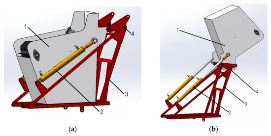 Schematic diagram of automatic unloading of potato collection box. 1. Potato collection box; 2. Hydraulic cylinder; 3. Rotating shaft of the potato collection box; 4. Box bracket: (a) Potato box horizontal; (b) Potato box lifted.