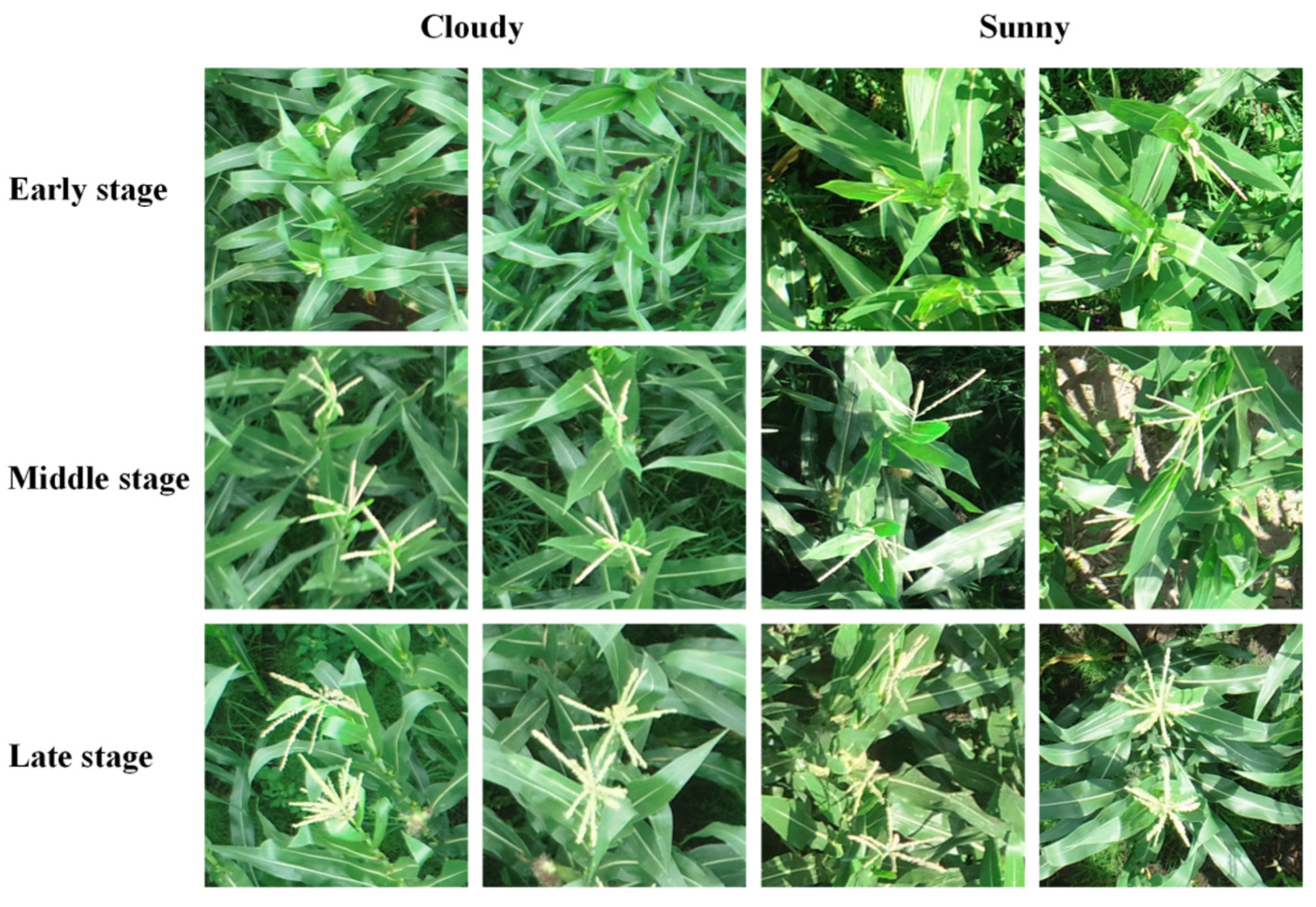 The tasseling stage of maize coincides with midsummer, characterized by complex and variable weather conditions that can cause varying degrees of reflection on maize leaves. To ensure the dataset meets the robustness requirements of the model, the collected maize field images include both sunny and cloudy weather conditions. The morphology of maize tassels also changes significantly throughout the tasseling process. We collected tassel images covering the entire tasseling process and divided it into three stages—early, middle, and late—based on tassel morphology. Specifically, the early tasseling stage refers to when most of a maize tassel remains enclosed in leaves; the middle stage is when most of the tassel has emerged from the leaves but has not yet started pollen shedding; and the late stage is characterized by full tassel extension and initiation of pollen shedding, which corresponds to the traditionally defined VT (vegetative tasseling stage) [
