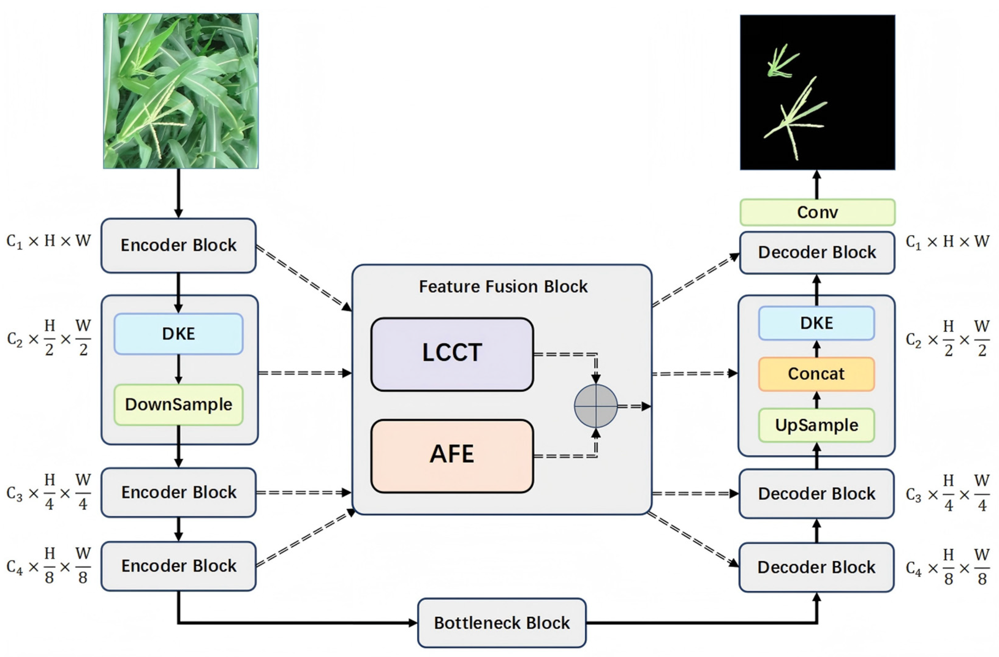 Figure 3). DECC-Net is mainly composed of Encoder Blocks, Decoder Blocks, and a Feature Fusion Block. The novelty of this model lies in the integration of our proposed Dynamic Kernel Feature Extraction (DKE) modules into Encoder Blocks and Decoder Blocks to enhance the capability of capturing multi-scale maize tassel features from complex scenarios; meanwhile, the proposed Lightweight Channel Cross Transformer (LCCT) and Adaptive Feature Channel Enhancement (AFE) modules are integrated into the Feature Fusion Block, and their combination can jointly guide the adaptive fusion of multi-scale features, alleviate semantic discrepancies between features of different levels, and suppress the interference from irrelevant information such as leaf veins and leaf reflections.