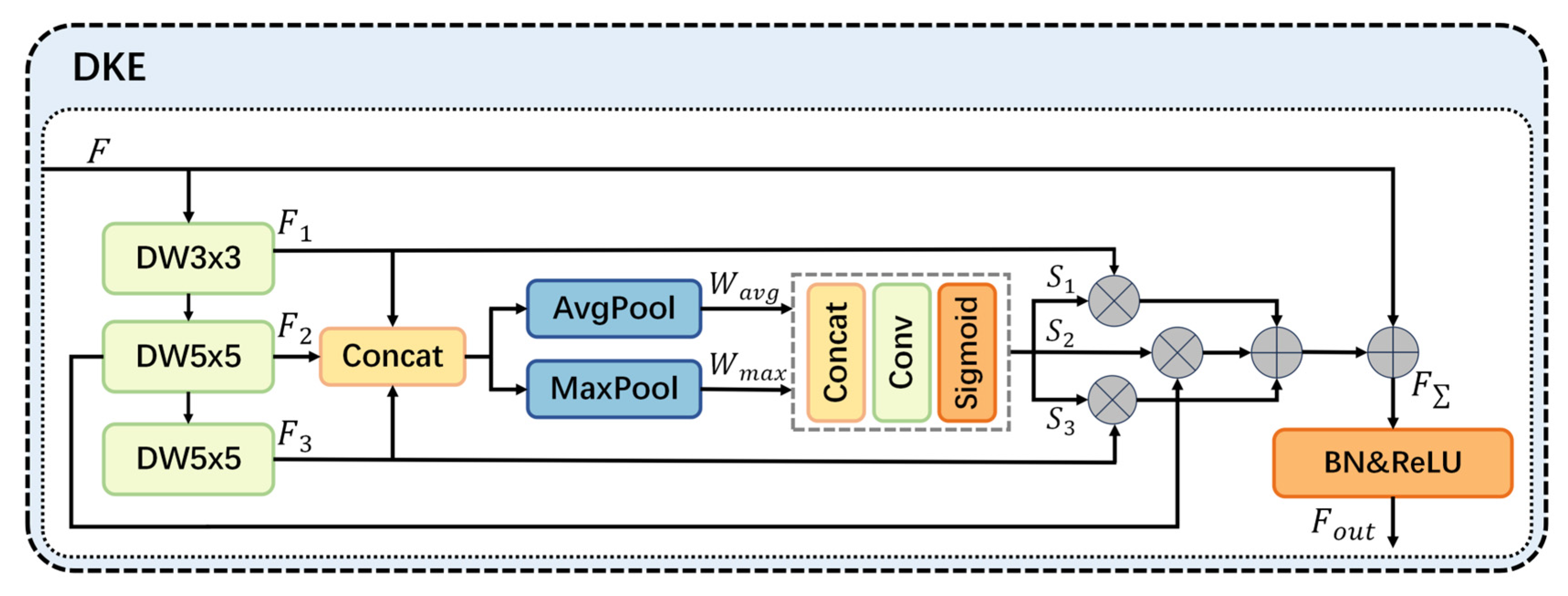 The operations of the DKE module are as follows: for an input feature map, we first employ three depthwise separable convolution layers, DW3 × 3, DW5 × 5, and DW5 × 5, and cascade them. The shallow DW3 × 3 kernel extracts features with rich local details, and cascading these kernels enables the deep DW layer to have a receptive field equivalent to an 11 × 11 convolution kernel, facilitating the capture of long-range global features. Moreover, compared to standard convolutions, using depthwise separable convolutions effectively reduces computational costs and the number of parameters.