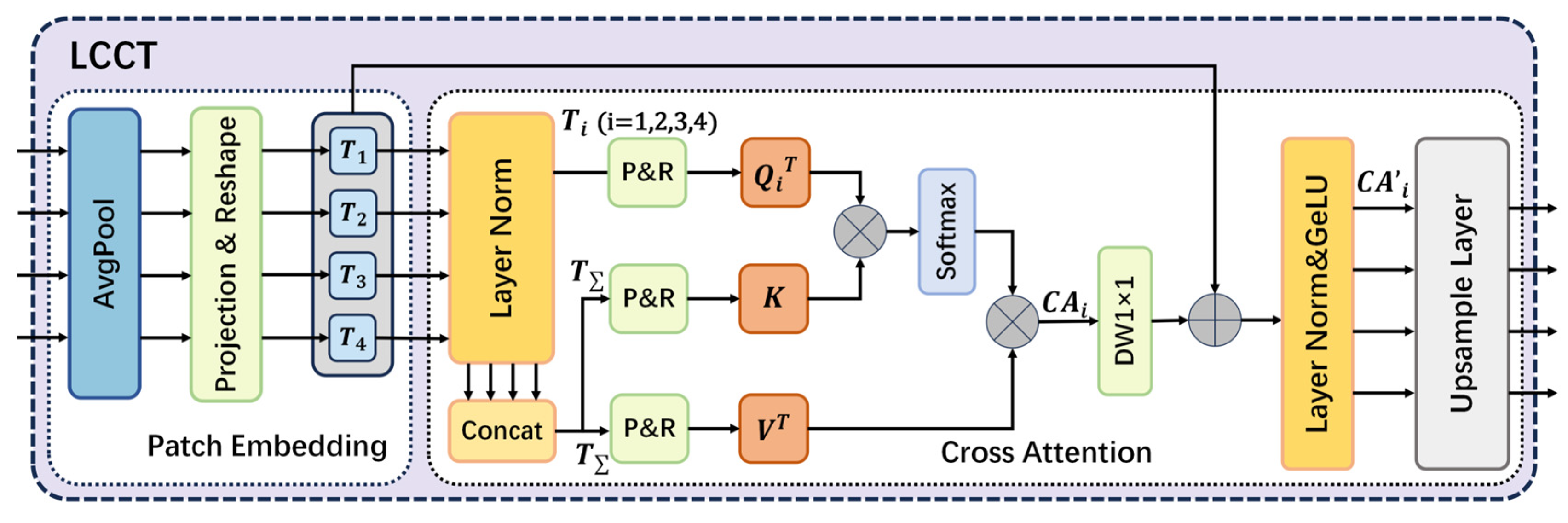 Finally, the upsampling layer restores the dimensions of to , followed by batch normalization and the ReLU activation function. This process yields four sets of outputs from the LCCT module.