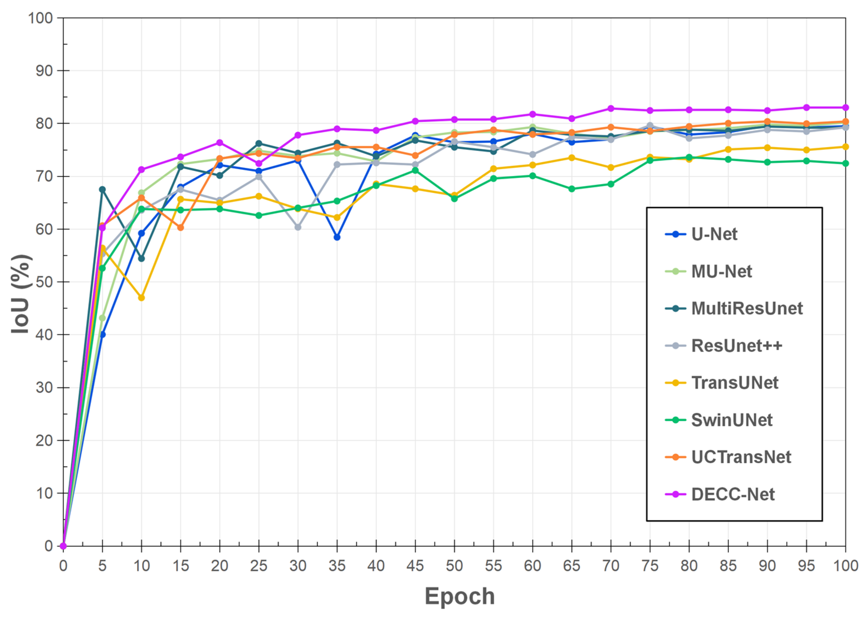 Figure 7 illustrates the IoU curves during the training process on the validation set. During the training process, DECC-Net’s IoU rapidly reaches a high level and achieves a better final convergence result compared to other network models.