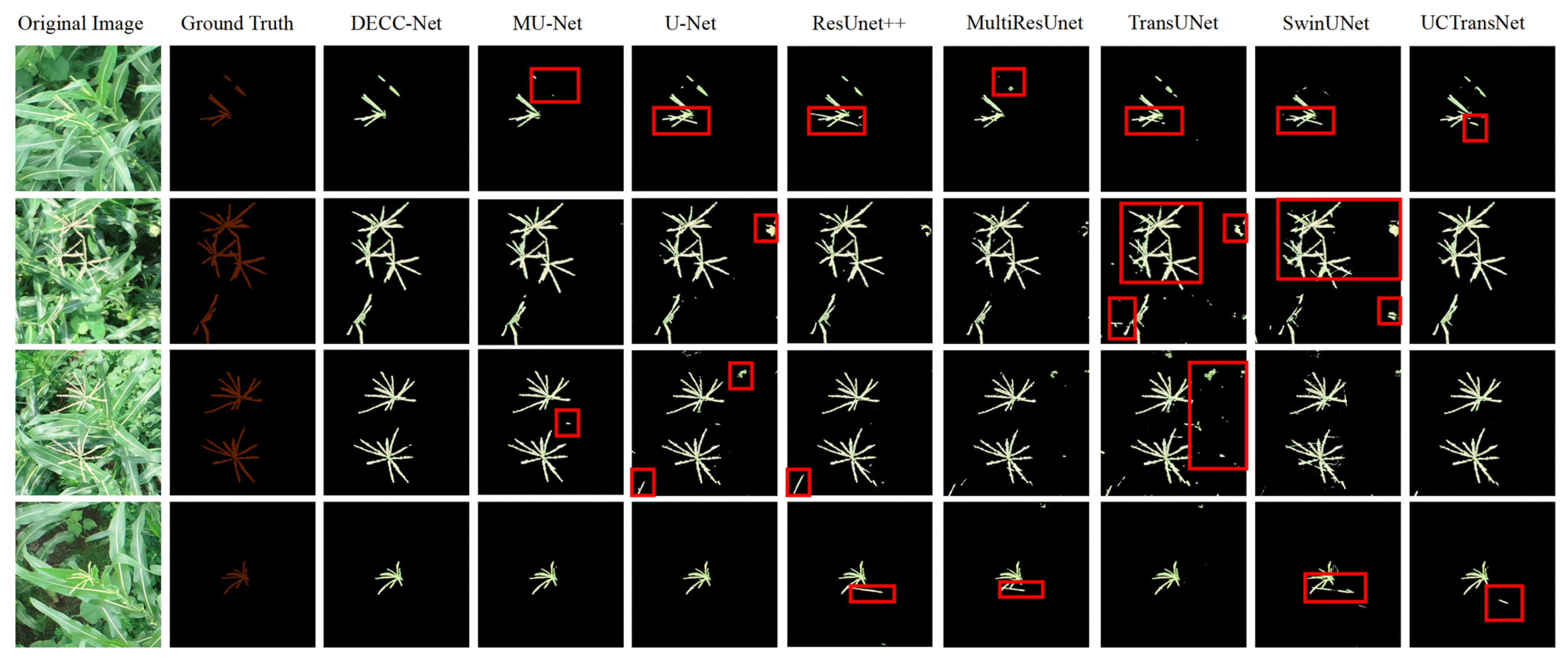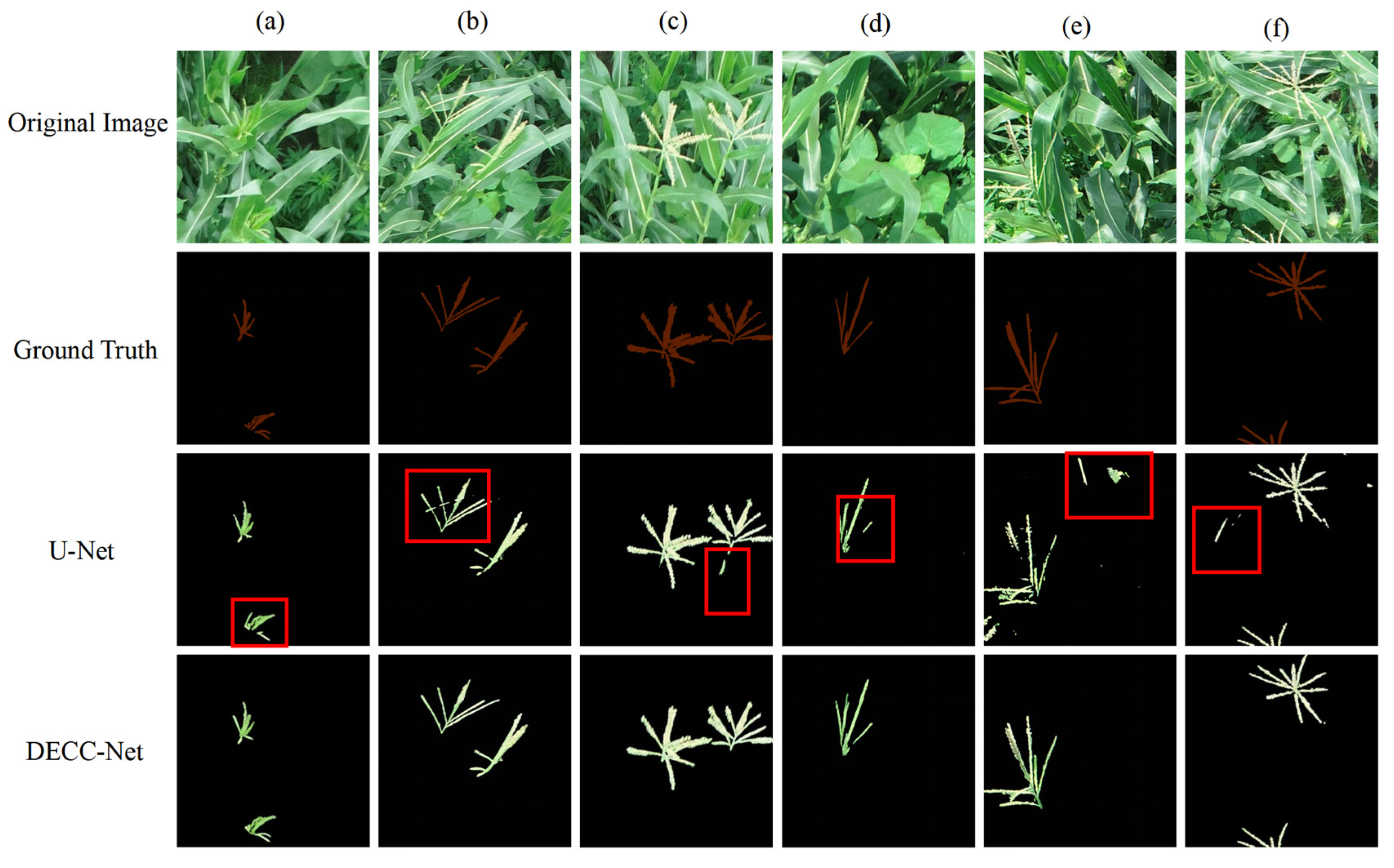 We compared DECC-Net with classic networks previously applied in the fields of maize tassel segmentation and maize canopy segmentation [