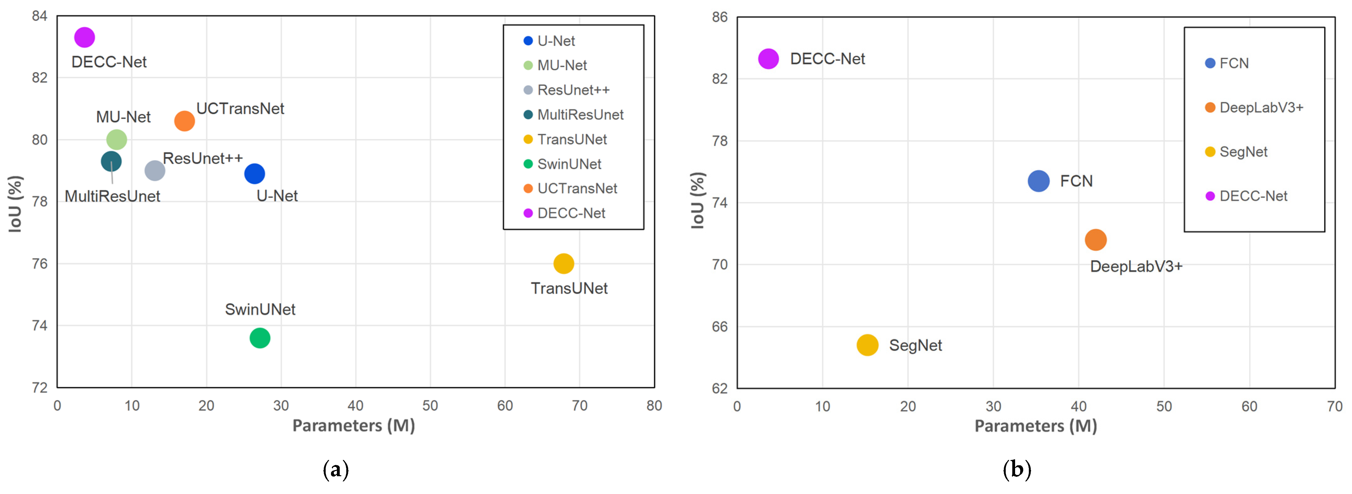 Figure 9a visually demonstrates the IoU values and parameter counts of multiple models, where DECC-Net achieves favorable segmentation performance while significantly reducing the parameter count.