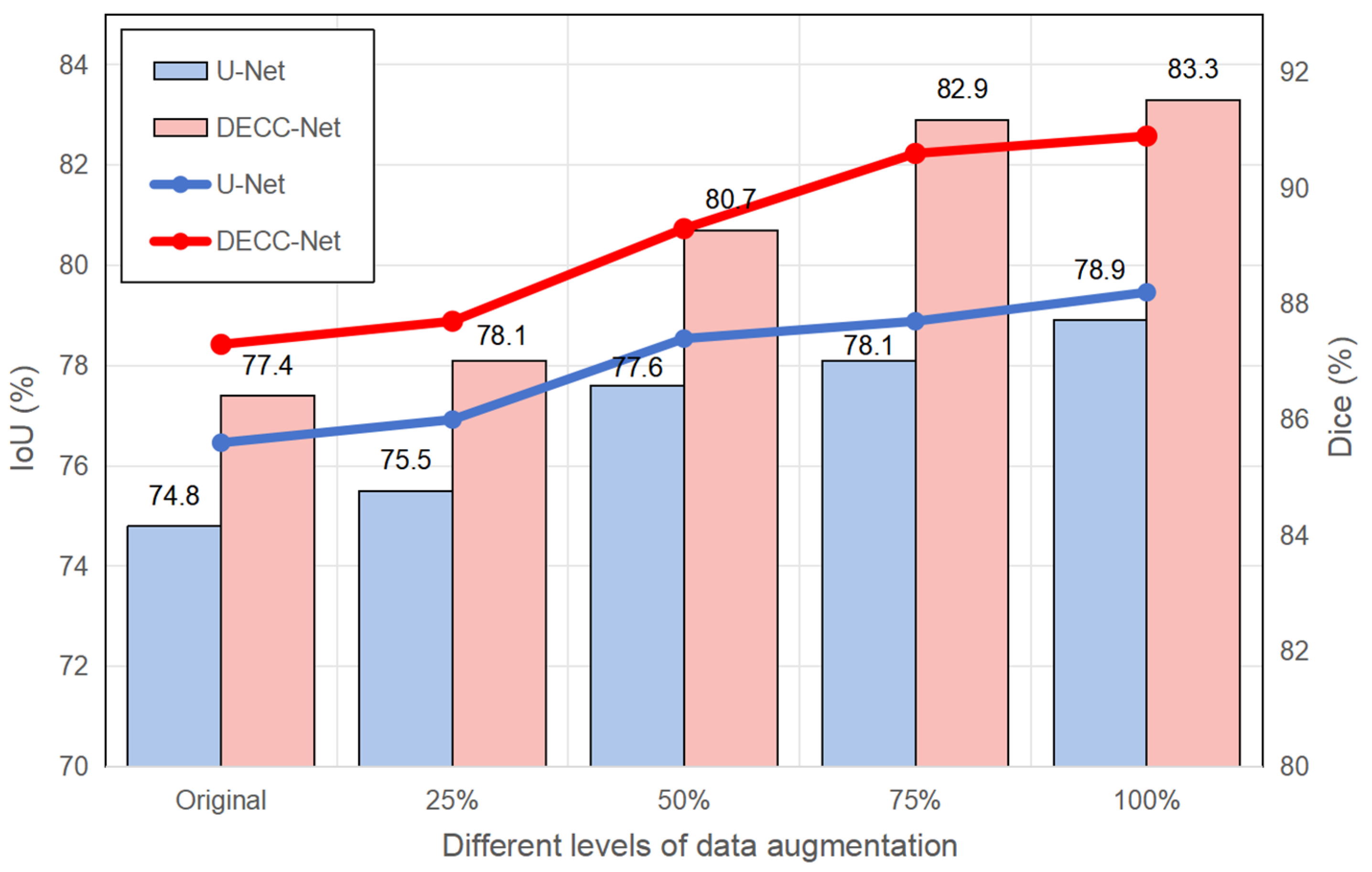 Figure 10. In the original group without data augmentation, DECC-Net achieved an IoU of 77.4% and a Dice of 87.3%, both higher than those of U-Net. As the level of data augmentation increased from 0% to 100%, both DECC-Net and U-Net showed varying degrees of improvement in performance. However, across all levels of data augmentation, DECC-Net consistently achieved higher IoU and Dice scores than U-Net, demonstrating the superiority of its segmentation performance under different data conditions.