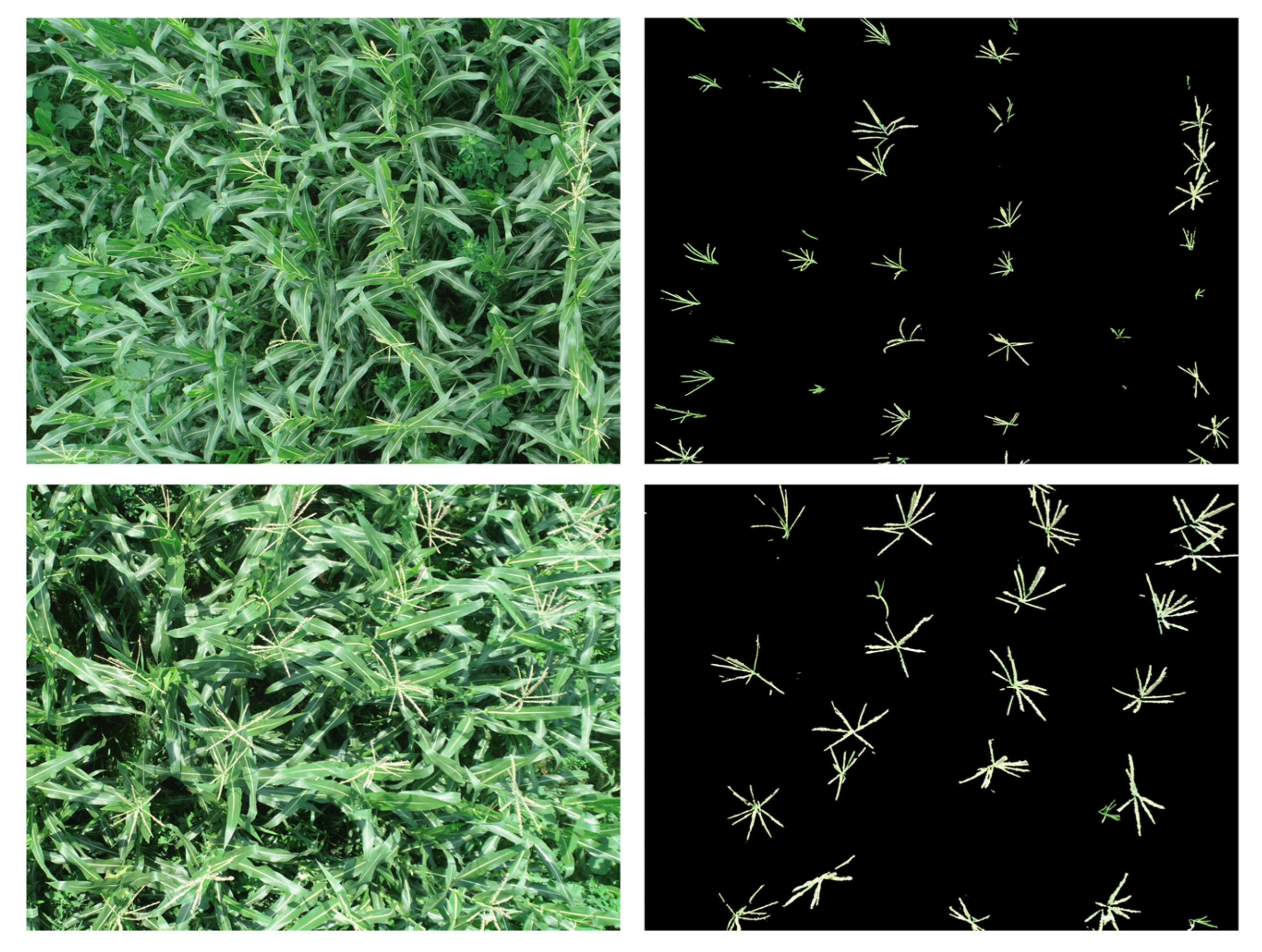 19]. Ultimately, a total of over 8000 maize tassel images covering different weather conditions and developmental stages were collected, with examples of tassels shown in
