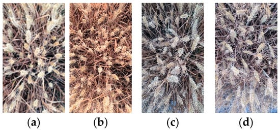 The dataset utilized in this study was manually collected. To align with practical application scenarios, the custom dataset images were collected in mid-June 2024 during the late maturation stage of wheat—the optimal period for yield measurement. Data collection occurred in Jingxiu District, Baoding City, Hebei Province (GPS coordinates: 38.88 °N, 115.38 °E; elevation: 29.4 m). A five-point sampling method was adopted, randomly selecting five 1 m2 plots per field for imaging, with all sampling points positioned >5 m from field boundaries to mitigate edge effects. All images were captured vertically downward at 1.2–1.5 m above ground level, covering approximately 1 m2 per frame to ensure accurate quantitative yield estimation. Real-world agricultural environments exhibit dynamic complexity: variables such as illumination intensity and wind speed impact image information representation and consequently model recognition performance. Accordingly, image acquisition spanned three diurnal periods (05:00–08:00, 11:00–13:00, and 17:00–19:00) with a specific emphasis on capturing data under gentle breeze conditions. Images were acquired using a Redmi K50 smartphone (58 MP effective resolution) to simulate real-world deployment scenarios. Representative dataset samples are shown in Figure 1.