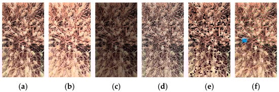 Image enhancement examples. (a) Original image; (b) brightness enhanced; (c) brightness reduced; (d) noise corrupted; (e) randomized occlusion; (f) wheat head annotations.
