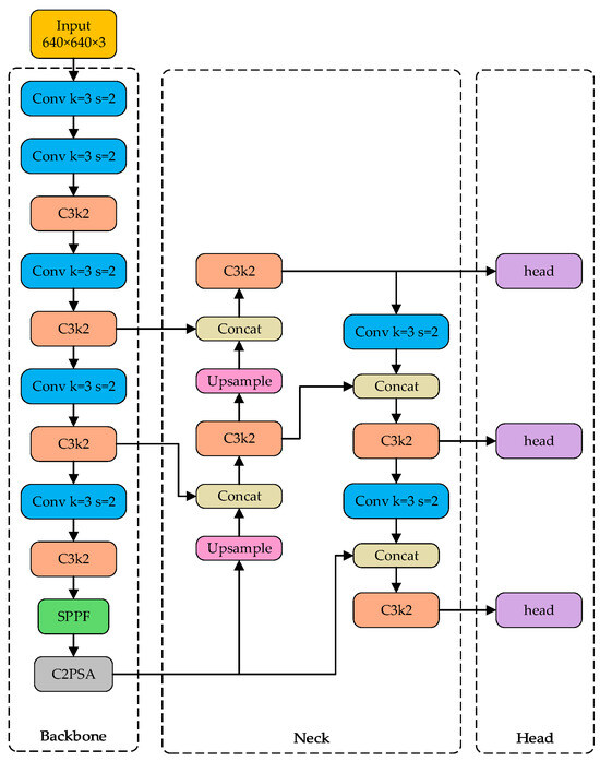 The YOLO series denotes single-stage object detection algorithms. Since its initial proposal by Redmon et al. in 2015, successive iterations have continuously optimized network architecture, feature extraction, and loss functions, progressively enhancing accuracy while maintaining high-speed detection. In contrast to two-stage detectors like Faster R-CNN [20], YOLO conducts object localization and classification simultaneously in a single forward pass, eliminating the need for complex region proposal generation and significantly enhancing detection efficiency. The YOLO v11 architecture consists of three components: Backbone, Neck, and Detection Head, as illustrated in Figure 3. Compared to YOLO v8, YOLO v11 introduces the C3k2 (CSP Bottleneck with 2 Convolutions) module [21] and C2PSA (Cross Stage Partial with Spatial Attention) dual-domain attention mechanism [21] in its backbone. The C3k2 module (Figure 4) constitutes the backbone’s core—an accelerated variant of CSP (Cross Stage Partial Networks) [22] deployed in YOLO v11. C3k2 operates in two configurations: when C3k = False, it functions as the C2f module (Figure 4a); when C3k = True, it becomes the C3k2 module (Figure 4b). When optimizing the C3 foundation, C3k2 sets its parameter to 2 to cascade two C3k blocks, thereby enhancing feature extraction efficiency and capability. This design increases inference speed while maintaining model stability and indirectly boosts accuracy through deeper feature extraction. The C2PSA module (Figure 5) integrates stacked PSA (Pyramid Split Attention) blocks [23]—an enhanced adaptation of SE (Squeeze-and-Excitation) attention [24]—for feature extraction and processing. SE attention explicitly models inter-channel dependencies to adaptively recalibrate channel-wise feature responses, thereby enhancing representational capacity. PSA enhances this mechanism via pyramidal feature splitting, refining dependency modeling through multi-scale context aggregation. By embedding PSA as standalone components that replace original structures, C2PSA significantly amplifies feature extraction capability, elevating both precision and mean average precision (mAP).