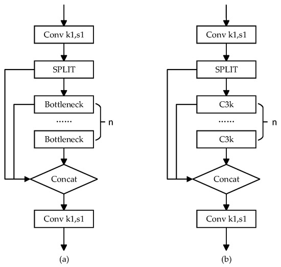 C3k2 module schematic diagram. (a) C2f module schematic, (b) C3k2 module schematic.