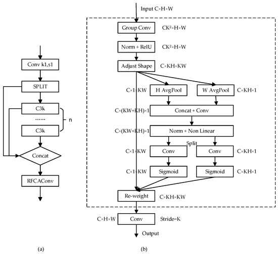 (a) C3k2_RFCAConv module schematic; (b) RFCA model architecture.