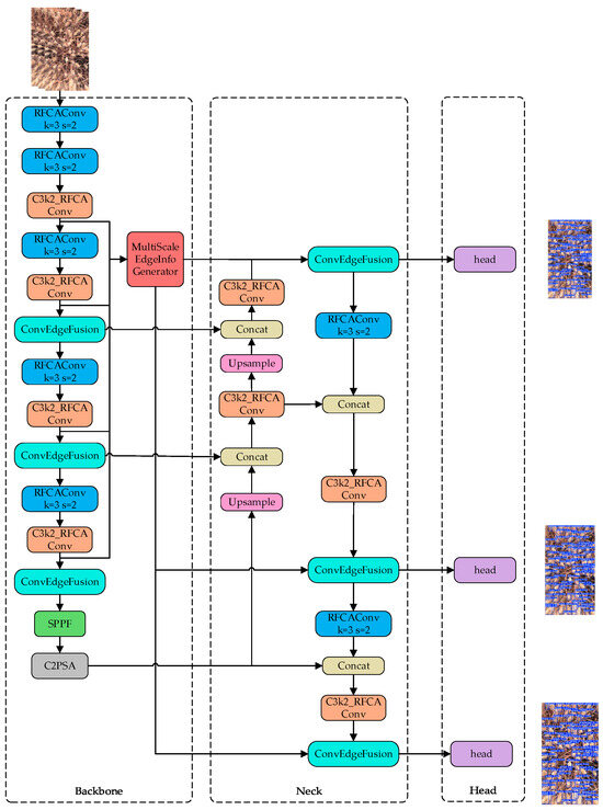 Field wheat head images typically exhibit complex characteristics including a dense arrangement, occlusion, and scale variation. To enhance detection model performance for wheat head recognition in complex field environments and meet high-precision yield estimation requirements, this study introduces structural improvements to the lightweight YOLO v11n framework, proposing a novel object detection network: YOLO v11n-GRN. Firstly, addressing insufficient edge feature perception in traditional detectors under complex backgrounds, we design the Global Edge Information Transfer (GEIT) module integrated with a Multi-scale Edge Information Generator (MSEIG), enabling effective transmission and fusion of shallow edge features to deep semantic features. Secondly, to overcome limited receptive fields and weak spatial modeling capabilities, we integrate the C3k2 module with RFCAConv to construct the novel C3k2_RFCAConv module and optimize convolutional operations within the YOLO framework to enhance multi-scale perception and feature localization accuracy. Finally, acknowledging inevitable scale variations in field images, we adopt the Normalized Wasserstein Distance (NWD) as the localization loss to resolve instability in small-target regression with traditional IoU losses, significantly improving robustness and accuracy for small-scale wheat head detection. The enhanced model architecture is depicted in Figure 8.