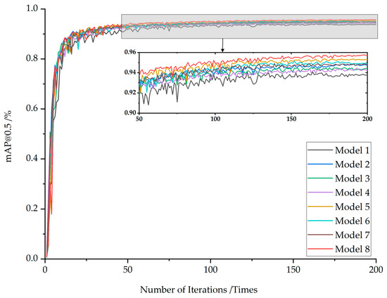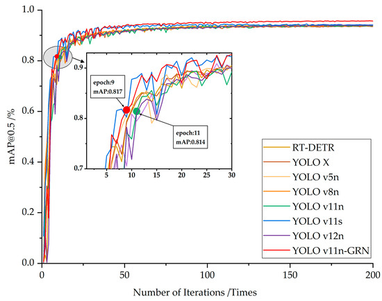 To more intuitively demonstrate the performance improvement of the proposed improved model YOLO v11n-GRN, training process curves of the mean average precision (mAP) were plotted for the proposed model and mainstream detection models (RT-DETR, YOLO X, YOLO v5n, YOLO v8n, YOLO v11n, YOLO v11s, and YOLO v12n) after 200 training epochs (as shown in Figure 9). Additionally, curves illustrating the variation trends of the mean average precision training process with or without each improved module were also plotted (as shown in Figure 10) for comparative analysis.