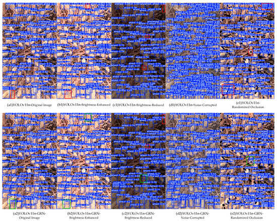 To more intuitively compare the specific performance of the baseline model YOLO v11n and the proposed improved model YOLO v11n-GRN, a set of model detection visualization results for wheat ear images randomly selected from the self-built dataset are presented, as shown in Figure 11. The test set comprises five image variants: (a) original, (b) brightness enhanced, (c) brightness reduced, (d) noise corrupted, and (e) randomized occlusion samples. Blue bounding boxes denote correct detections, while red boxes indicate false positives or missed detections. Analysis reveals distinct performance advantages of YOLO v11n-GRN: In the original image, the baseline model missed detecting a wheat head in the lower-left area (Figure 11(a1)), whereas YOLO v11n-GRN successfully identified it (green box in Figure 11(a2)). Similarly, under brightness-enhanced conditions, YOLO v11n missed two targets that were accurately detected by the proposed model. Although both models exhibited occasional detection failures in brightness-reduced scenarios (Figure 11(c1,c2)), YOLO v11n-GRN maintained a higher detection accuracy. Notably, significant error rates persisted for both models when processing noise-corrupted and occluded images, with false positives being particularly prevalent in noisy conditions. Despite these challenges, YOLO v11n-GRN demonstrated measurable improvements over the baseline, substantially reducing false detection rates across challenging conditions. This comparative analysis demonstrates the practical detection efficacy enhancement achieved by the proposed model modifications.