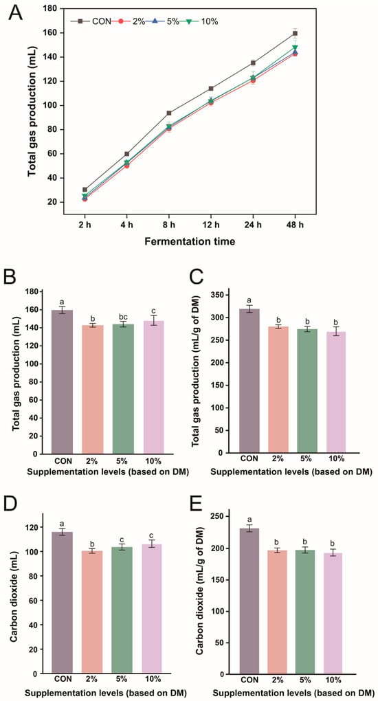 Total gas production and carbon dioxide production of treatment diets in in vitro study. (A) The cumulative gas production curve; (B,C) total gas production characteristics; (D,E) carbon dioxide production characteristics. CON: a diet without G. lemaneiformis. a–c indicates p < 0.01.