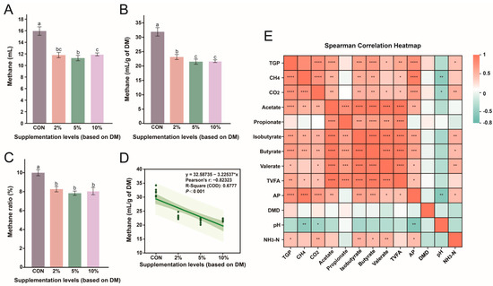 Methane production of treatment diets in in vitro study. CON: a diet without G. lemaneiformis. a–c indicates p < 0.01, * p < 0.05, ** p < 0.01, *** p < 0.001, **** p < 0.0001. (A–D) Methane production characteristics; (E) correlation analysis of methane with fermentation parameters. TGP, total gas production; DMD, dry matter digestibility; TVFA, total volatile fatty acids; AP, the acetate to propionate ratio; NH3-N, ammonia nitrogen.