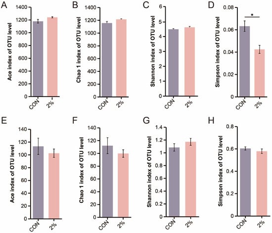 The microbial diversity of bacteria and archaea in the rumen fluid is presented in Figure 3. Compared with the CON group, there were no differences in the abundance of bacteria (Figure 3A,B) and archaea (Figure 3E,F) according to the Ace and Chao 1 indexes in the 2% group. However, the Simpson’s index indicated that bacterial diversity was significantly higher in the 2% group (p = 0.02) (Figure 3D), whereas archaeal diversity was not affected (Figure 3G,H).