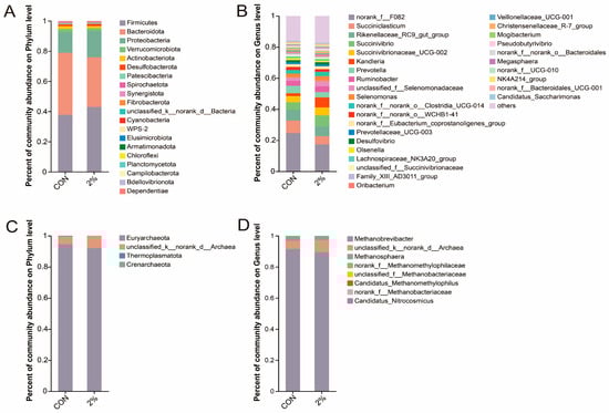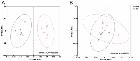 The β diversity of bacteria and archaea in the CON and 2% groups was visualized using principal coordinate analysis (PCoA) plots (Figure 4). Within bacteria, a clear separation was noted between the CON and 2% groups (R = 0.8778, p = 0.003), whereas the archaeal community composition showed no difference between the two groups (R = 0.05, p = 0.282).