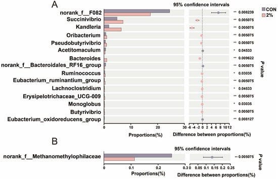 Based on microbiome composition analysis at the genus level, 15 bacteria and 1 archaeon in total were identified as differentially abundant between the two groups (p < 0.05) (Figure 6). Notably, only four bacteria exhibited higher abundances in the CON group. Among all bacteria, variations in the relative abundances of norank__f__F082, Succinivibrio, and Kandleria were more pronounced. In addition, the relative abundance of the archaeal genus g__norank__Methanomethylophilaceae was found to be lower in the 2% group (p < 0.01).