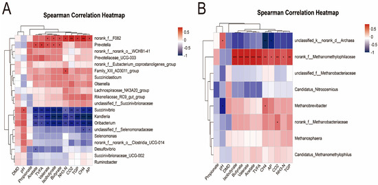 The relationships between environmental factors (including TGP, CH4, CO2, pH, DMD, TVFA, acetate, propionate, butyrate, isobutyrate, valerate, AP, and NH3-N) and the top 20 genera were analyzed at the genus level (Figure 7). Among these genera, Kandleria, Succinivibrio, and Oribacterium showed negative correlations with most environmental factors, except for propionate, pH, and DMD. Moreover, there was a significantly positive correlation between norank_f_F082 and TGP, CO2, CH4, and AP (Figure 7A). Notably, variations in VFA and CO2 were strongly correlated with variations in CH4. According to Figure 7B, CH4 was also positively correlated with norank_f__Methanomethylophilaceae and Methanobrevibacter, whereas unclassified_k_norank_d_Archaea showed a negative correlation with CH4.