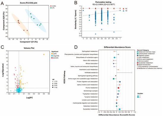Metabolite analysis revealed changes in metabolite and metabolic pathways after supplementation with 2% G. lemaneiformis. (A) Partial least squares discriminant analysis plot (PLS-DA) depicting rumen metabolite distribution. (B) PLA-DA permutation test to assess model reliability. (C) Volcano plot showing differential metabolites between the CON and 2% groups (yellow and red indicate increased and decreased significance, respectively). (D) KEGG pathway enrichment suggests that significant changes occurred in the pathways. Student’s t-test and two-tailed test were used to verify differential metabolites and correct p values. The BH test adjusted the p value of the KEGG pathway. * p < 0.05, ** p < 0.01.