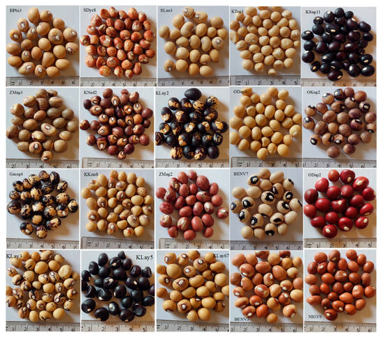 Bambara groundnut [BGN, Vigna subterranea (L.) Verdc], also known as Bambara bean or Bambara nut, belongs to the family of Fabaceae [1,2,3,4]. It is one of the oldest legume crops that originated in Africa. BGN is a neglected and underutilised species (NUS), mostly produced by females for subsistence purposes [5], and regarded negatively as a poor’s crop, women’s crop, elders’ crop, or widows’ crop. It is mainly cultivated on a small scale in pure culture [6] or in association with other crops [7]. The total global BGN production was estimated at 246,511.3 tonnes in 2022 [8]. West Africa accounts for more than half (167,031.28 tonnes) of the global BGN production [8]. BGN production faces several constraints, such as a lack of resources, including access to quality seeds and cultivars, adapted agronomic techniques, capital and extension services, land, and storage facilities [9]. BGN marketing is limited to local markets, and there are no data on cross-border trade [10].