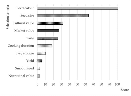 Ten selection criteria of interest—including seed colour, seed size, cultural value, market value, seed taste, seed cooking duration, easy storage, crop yield, seed appearance (smooth seed), and nutritional value—were recorded across the value chain participants (Figure 3). The most important criteria identified were seed colour, seed size, cultural value, and market value. In reference to colour, the cream-coloured seeds were more preferred (89.36% of participants) than the other seed colours (10.64% of participants). In relation to seed size, large seeds were more preferred (76.56% of participants) than medium (15.63% of participants) and small ones (7.81% of participants). All the participants preferred short cooking duration and high yield over alternative trait values.