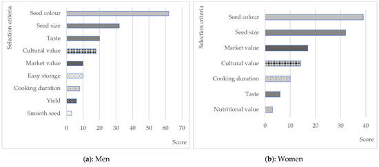 According to gender, nine relevant selection criteria were recorded for men and seven criteria for women (Figure 4). Six of the criteria (seed colour, seed size, cultural value, market value, taste and cooking duration) were common to both men and women. Some differing criteria according to gender were exhibited. Indeed, nutritional value is a criterion of interest for women only, while seed appearance (smooth seed), crop yield and easy storage are criteria of interest for men only. For both men and women, seed colour, seed size and cultural value are the most important criteria. Referring to colour, the cream-coloured seeds were more preferred by both men (91.94% of participants) and women (87.18%) than the other colours. In reference to seed size, the large seeds were more preferred by both men and women (100% and 53.13%, respectively) than medium (31.25% for women) and small ones 15.62% for women). The chi-square test across gender indicated significant differences between women’s and men’s selection criteria (Table 5).