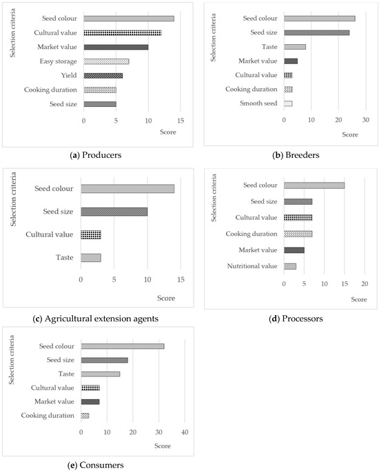 Regarding criteria of interest across different groups of value chain participants, seven criteria were listed as relevant criteria for producers and breeders, six key criteria for processors and consumers and four criteria for agricultural extension agents (Figure 5). Three criteria (seed colour, seed size, cultural value) were common to all the value chain participants. However, some differing criteria were also highlighted, depending on the different groups of value chain participants. The importance of the criteria varied according to the participants. For example, criteria such as seed taste, market value and seed cooking duration are of interest to breeders and consumers, while crop yield and easy storage of seeds are criteria of interest to producers only. In relation to colour, the cream-coloured seeds were preferred by all the participants. Indeed, 84.38% of consumers, 100% of producers, 100% of breeders, 66.67% of processors and 100% of agricultural extension agents preferred the cream-coloured seeds, while 15.62% of consumers and 33.33% of processors preferred the other colours. As for seed size, the large seeds were preferred by all the participants over medium and small ones. One hundred per cent (100%) of producers, processors and consumers, 58.34% of breeders and 50% of agricultural extension agents preferred large seeds. Only 20.83% of breeders preferred medium and small sizes, respectively, while 50% of agricultural extension agents preferred medium size. The chi-square test, according to value chain participants, showed significant differences between participants’ selection criteria of interest (Table 6).