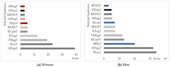 With regards to gender preferences among selected core landraces, both men and women preferred ODap3 and SLeo1 (Figure 8). However, the priority in choice varied according to men and women. Indeed, ODap3 is the women’s most preferred landrace while SLeo1 is the men’s most preferred landrace. In addition, there are some specific choices according to gender. BPbi3, KLay2, and BENV3 were selected by men only, while SDyr8 and OKog2 were selected by women only. In this respect, the chi-square test indicated significant differences in men’s and women’s preferences (Table 7).