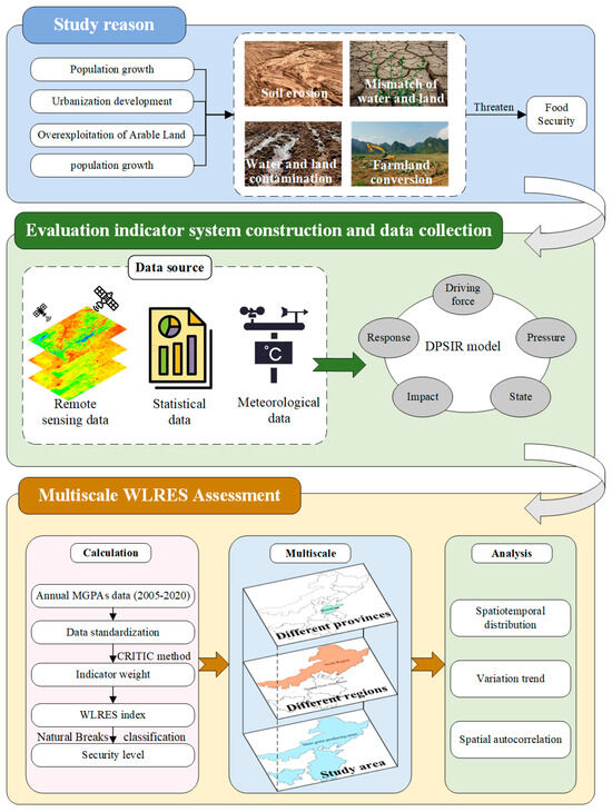 Scientific evaluation of WLRES is crucial for ensuring food security. This study selected 180 cities in China’s MGPAs as research objects. Based on the DPSIR model, a WLRES assessment system with 25 indicators was constructed. The CRITIC method and Natural Breaks classification were applied to calculate and grade the WLRES index values. Kernel density estimation and Moran’s I were combined to analyze the dynamic trends and spatial distribution characteristics of WLRES across different scales. The main conclusions are as follows: