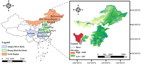 Combined with the availability of data, this paper selects 180 cities in MGPAs as the study area. In order to facilitate the analysis, the study area is divided into three subregions based on geographical characteristics: the northern region–Inner Mongolia Autonomous Region, Heilongjiang Province, Liaoning Province, Jilin Province; the Huang-Huai-Hai Basin—Hebei, Shandong, Henan, Jiangsu, and Anhui Provinces; and the Yangtze River Basin—Sichuan, Hubei, Hunan, and Jiangxi Provinces, as shown in (Figure 2). The northern region has a temperate monsoon climate, warm and rainy in summer and cold and dry in winter. In 2020, it had 34.32 million hectares of arable land (20.3% of the national total) and 7.6% of the nation’s water resources. The Huang-Huai-Hai Basin has a semi-arid, semi-humid climate zone and had 50.15 million hectares of arable land (30% of the national total) in 2020, with 7.19% of the national water resources. The Yangtze River Basin, with a warm and humid subtropical monsoon climate, had 32.29 million hectares of arable land (19.1% of the national total) in 2020 and 24.76% of the nation’s water resources.
