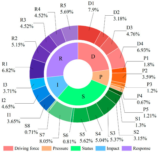 The weight calculation result is shown in Figure 3. The results reveal the state subsystem (S) to be the most influential, followed by the response (R) and driving-force (D) subsystems, whereas the pressure subsystem (P) exerts the weakest effect. At the indicator level, land reclamation rate (S7) and population density (D1) exhibit the highest weights, signifying that agricultural expansion and anthropogenic activities constitute the principal determinants of WLRES variability. By contrast, the markedly lower weights of water consumption per 10,000-yuan GDP (P4) and per-capita water resources (S8) suggest that absolute water availability is not a pivotal driver of ecological security issues within the MGPAs.