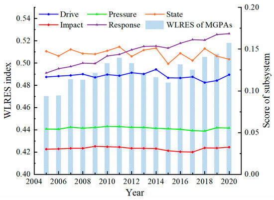 Trends in the overall WLRES index and scores of subsystems in MGPAs from 2005 to 2020.