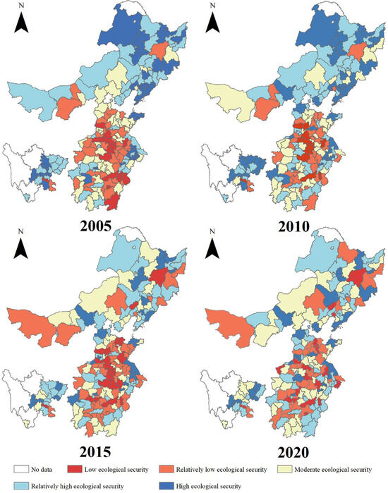 Introduced by the International Institute for Applied Systems Analysis (IIASA) in 1989, ecological security denotes the condition where human life, health, well-being, and adaptive capacity remain unthreatened [7]. During this period, ecological security was mainly judged by assessing chemical indicators related to pollution, but the overall health of the ecosystem was neglected [8]. As understanding of ecosystem complexity deepened, the concept of ecological security expanded to encompass natural, economic, and social dimensions. Currently, ecological security refers to the structural and functional stability of ecosystems that can meet the socio-economic development needs of both present and future generations [9].