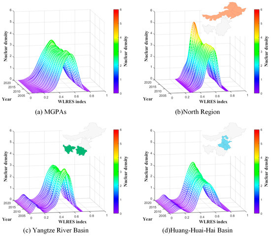In order to facilitate the analysis of trends in urban WLRES characteristics, the WLRES kernel density map (Figure 6) was used to represent the evolutionary trends in the distributional characteristics of urban WLRES within the MGPAs and the three sub-regions.