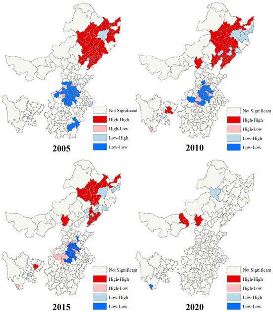 LISA cluster distribution of WLRES for 180 MGPAs Cities in 2005, 2010, 2015, and 2020.