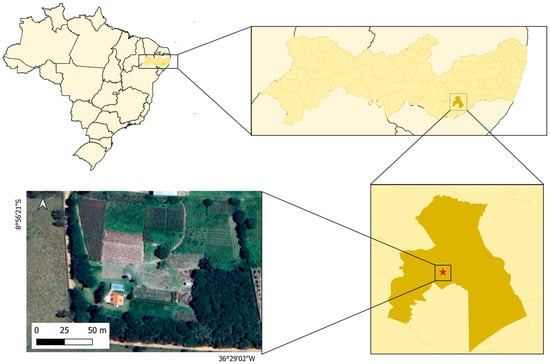 The sandy soil utilized in this study was collected from a site undergoing ecological regeneration within a tropical dry forest ecosystem located in Garanhuns, Pernambuco, Brazil (8°56′18.6″ S, 36°28′57.9″ W; Figure 1), at an elevation of 705 m above sea level. Formerly degraded by low-yield pastureland, the area has been left to regenerate naturally for the past 15 years and is now predominantly colonized by native vegetation typical of the Caatinga biome—the largest expanse of seasonally dry tropical forest globally. According to the World Reference Base for Soil Resources [], the soil is classified as Regosol. The regional climate is characterized as mesothermal tropical highland (Cwa) under the Köppen climate classification system, with a mean annual temperature of approximately 20 °C and an average annual precipitation of 1300 mm.