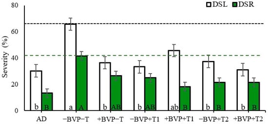 Root rot severity index in grapevine seedling leaves and roots in soil treated with grapevine pruning biochar (BVP) and Trichoderma aureoviridae strains. AD = additional control (no Trichoderma, no biochar, and no pathogen); −T = no Trichoderma; +T1 = Trichoderma aureoviride URM 6668; +T2 = T. aureoviride URM 3734; -BVP = without biochar; +BVP = with grapevine pruning biochar. DSL = disease severity on leaves; DSR = disease severity on roots. Means followed by the same lowercase letter do not differ significantly for the DSL variable, while means followed by the same uppercase letter do not differ significantly for the DSR variable. Statistical differences were determined using Tukey’s test at a 5% significance level (p < 0.05). The black (DSL) and green (DSR) dashed horizontal lines correspond to the highest observed severity percentages.