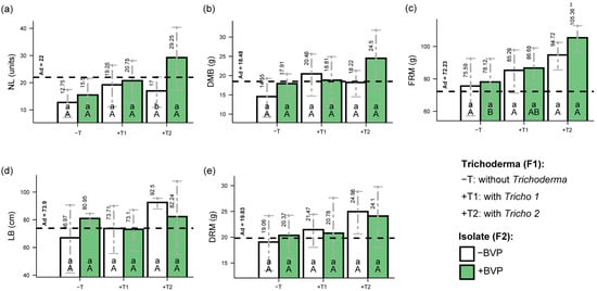 Grapevine development in soil treated with grapevine pruning biochar (BVP) and Trichoderma aureoviridae strains and inoculated with Fusarium equiseti (P1I3). AD = additional control (no Trichoderma, no biochar, and no pathogen); −T = no Trichoderma; +T1 = Trichoderma aureoviride URM 6668; +T2 = T. aureoviride URM 3734; -BVP = without biochar; +BVP = with grapevine pruning biochar. NL = number of leaves (a); DMB = dry mass of branches (b); FRM = fresh root matter (c); LB = length of branches (d); DRM = dry root mass (e). Means followed by the same lowercase or uppercase letters within each level of Trichoderma (Factor 1) and biochar (Factor 2) do not differ significantly, as determined by Tukey’s test at the 5% significance level (p < 0.05). Means marked with asterisks differ significantly from the additional control treatment (dashed line), based on Dunnett’s test at the 5% significance level.