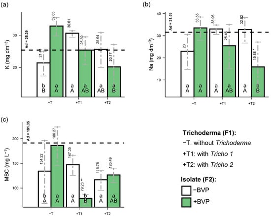 Changes in the attributes of soil treated with biochar and Trichoderma strains, cultivated with grape plants, and inoculated with Fusarium equiseti (P1I3). K = potassium contente (a); Na = sodium contente (b); MBC = microbial biomass carbon (c). AD = additional control (no Trichoderma, no biochar); −T = no Trichoderma; +T1 = Trichoderma aureoviride URM 6668; +T2 = T. aureoviride URM 3734; -BVP = without biochar; +BVP = with grapevine pruning biochar. Means followed by the same lowercase or uppercase letters within each level of Trichoderma (Factor 1) and biochar (Factor 2) do not differ significantly, as determined by Tukey’s test at the 5% significance level (p < 0.05). Means marked with asterisks differ significantly from the additional control treatment (dashed line), based on Dunnett’s test at the 5% significance level.