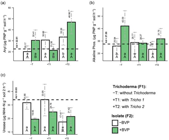 Enzymatic activities of soil treated with biochar and Trichoderma strains, cultivated with grape plants, and inoculated with Fusarium equiseti (P1I3). Aryl = arylsulfatase activity (a); Alkaline Phosp. = alkaline phosphatase activity (b); Urease = urease activity (c). AD = additional control (no Trichoderma, no biochar); −T = no Trichoderma; +T1 = Trichoderma aureoviride URM 6668; +T2 = T. aureoviride URM 3734; -BVP = without biochar; +BVP = with grapevine pruning biochar. Means followed by the same lowercase or uppercase letters within each level of Trichoderma (Factor 1) and biochar (Factor 2) do not differ significantly, as determined by Tukey’s test at the 5% significance level (p < 0.05). Means marked with asterisks differ significantly from the additional control treatment (dashed line), based on Dunnett’s test at the 5% significance level.