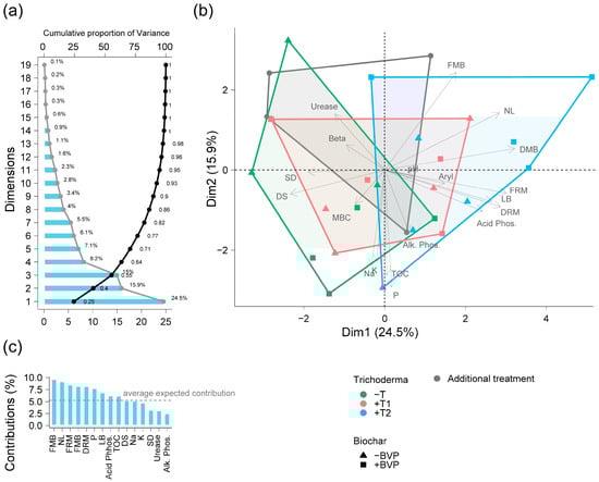 An exploratory analysis of treatments with biochar and Trichoderma strains applied to Cabernet Sauvignon grape seedlings (rootstock SO4) inoculated with Fusarium equiseti (P1I3). (a) The contributions of the principal components. (b) A biplot of the principal component analysis. The levels of the Trichoderma factor are classified in different colors, while the levels of biochar are distinguished by different shapes. (c) The average contribution of the variables to the variance in the multivariate model. AD = additional control (no Trichoderma, no biochar); −T = no Trichoderma; +T1 = Trichoderma aureoviride URM 6668; +T2 = T. aureoviride URM 3734; -BVP = without biochar; +BVP = with grapevine pruning biochar. Aryl = arylsulfatase activity; Alkaline Phosp. = alkaline phosphatase activity; Urease = urease activity. NL = number of leaves; DMB= dry mass of branches; DRM = dry root mass; LB = length of branches; DRM = dry root mass; FMB= fresh mass of branches; FRM = fresh root mass; DS = disease severity; SD = stem diameter; K = potassium content; Na = sodium content; MBC = microbial biomass carbon; Aryl = arylsulfatase activity; Alkaline Phosp. = alkaline phosphatase activity; Urease = urease activity.
