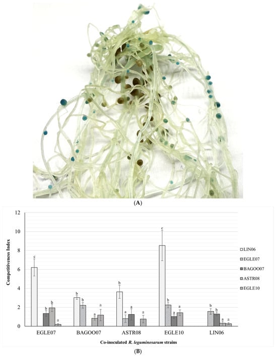 Competition assays between R. leguminosarum strains. (A) Pea root system inoculated with gusA [pOPS0263] tagged strain (blues nodules) and strain without any marker (white nodules) after staining with X-GlcA. (B) The competitiveness index between R. leguminosarum isolates inoculated in “Egle DS” genotype pea plants. Error bars indicate the standard deviations within four biological replications at each treatment. Values marked with the same letter are not significantly different at p ≥ 0.05 (ANOVA, Tukey HSD). (C) The competitiveness index between R. leguminosarum isolates inoculated in “Respect” genotype pea plants. Error bars indicate the standard deviations within four biological replications at each treatment. Values marked with the same letter are not significantly different at p ≥ 0.05 (ANOVA, Tukey HSD).